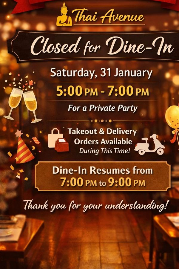 Please be kindly informed that Thai Avenue will be closed for dine-in on Saturday, 31 January, from 5:00 PM to 7:00 PM, due to a private party booking.
