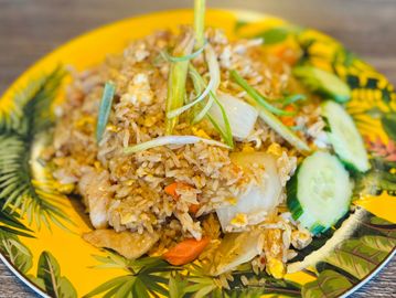 Pineapple fried rice with egg, coconut milk, pineapple, onion, green onion, curry powder and cashew nut.