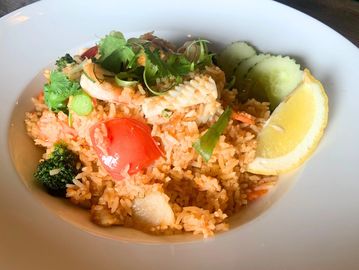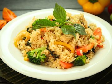Fried rice with Tom yum paste, tomatoes, mushroom, onion, lime leaves, lemongrass ,cilantro, galangal