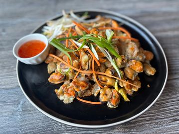 Pan-fried crispy mussel with bean sprout, egg, green onion ,black pepper serve with spicy and sour sauce.