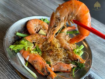 Baked prawn with glass noodle ,celery, green onions , shiitake mushroom ,ginger and Thai spices.