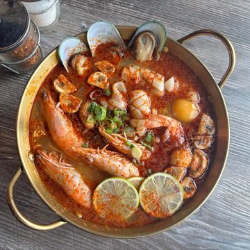 Traditional Tomyum Noodle soup with MAMA noodle , Fresh egg , shrimps , squids , Mussels , slice of limes ,lemongrass, galangal, lime leaves, green onion and chilli.