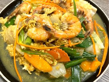 Egg , milk stir fried with curry powder, carrot , onion ,green onion , prawns and squids